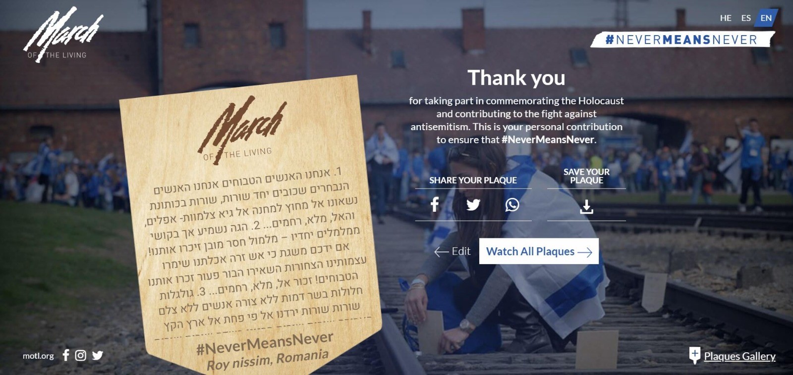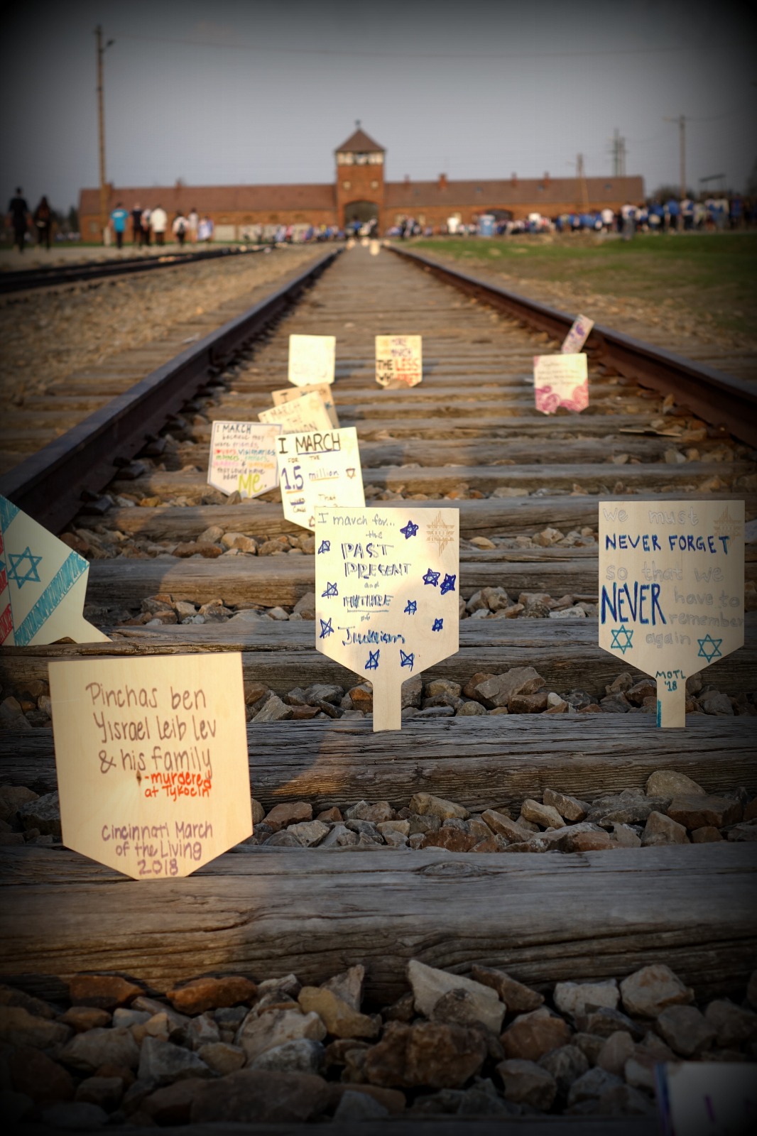 Tradiția March of the Living este de a insera mesaje de aducere aminte și compasiune pe plăcuțe de lemn plasate pe linia de cale ferată care aducea trenurile morții, toate aceste plăcuțe fiind apoi colectate de organizatori și păstrate într-o mare arhivă. Colegii voștri participanți în anii anteriori au putut să facă acest lucru în fața faimoasei porți a lagărului Auschwitz-Birkenau, precum este exemplificat în imaginea de mai jos.